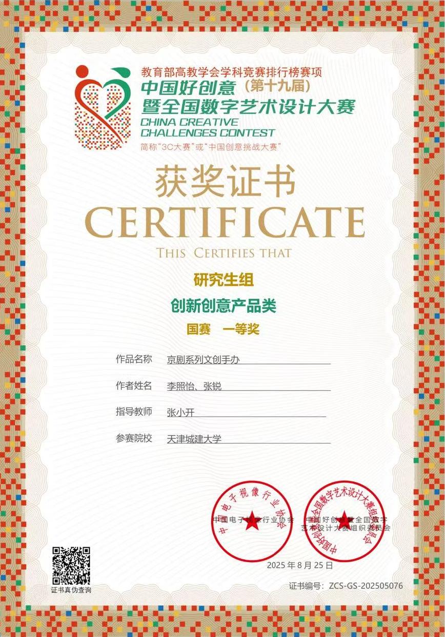 在专业竞赛中,他将理论知识与创新实践相结合。他作为核心成员完成的“京剧系列文创手办”项目,在中国好创意·第十九届全国数字艺术设计大赛中荣获国赛一等奖。此外,获2025年全国大学生数字媒体科技作品及创意竞赛省部级三等奖2项,展现了扎实的设计功底和出色的团队协作能力。