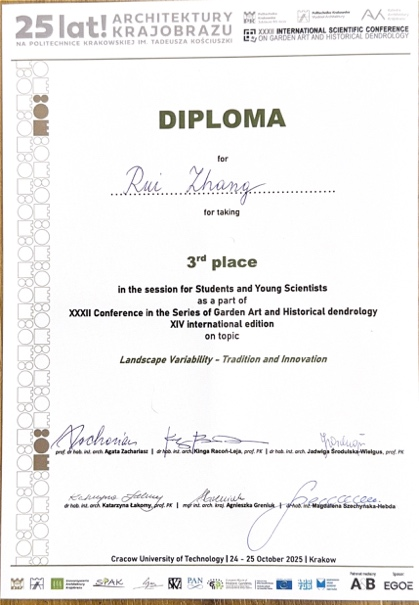 (3)第三十二届园林艺术与历史树木学国际会议学生与青年学者组第三名;