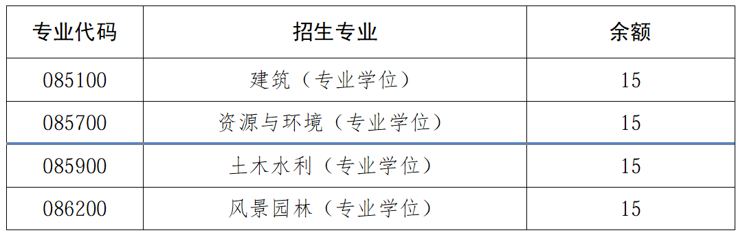 调剂到该专业的考生第一志愿专业应与资源与环境(专业代码085700)专业相同相近,包括化学(0703)、地理学(0705)、大气科学(0706)、地质学(0709)、生物学(0710)、生态学(0713)、公共卫生与预防医学(0779)、力学(0801)、机械工程(0802)、光学工程(0803)、仪器科学与技术(0804)、材料科学与工程(0805)、冶金工程(0806)、动力工程及工程热物理(0807)、电气工程(0808)、电子科学与技术(0809)、信息与通信工程(0810)、控制科学与工程(0811)、计算机科学与技术(0812)、建筑学(0813)、土木工程(0814)、水利工程(0815)、测绘科学与技术(0816)、化学工程与技术(0817)、地质资源与地质工程(0818)、矿业工程(0819)、石油与天然气工程(0820)、纺织科学与工程(0821)、轻工技术与工程(0822)、交通运输工程(0823)、船舶与海洋工程(0824)、航空宇航科学与技术(0825)、兵器科学与技术(0826)、核科学与技术(0827)、农业工程(0828)、林业工程(0829)、环境科学与工程(0830)、生物医学工程(0831)、食品科学与工程(0832)、城乡规划学(0833)、软件工程(0835)、生物工程(0836)、安全科学与工程(0837)、公安技术(0838)、网络空间安全(0839)、建筑(0851)、城乡规划(0853)、电子信息(0854)、机械(0855)、材料与化工(0856)、资源与环境(0857)、能源动力(0858)、土木水利(0859)、生物与医药(0860)、交通运输(0861)、风景园林(0862)、科学技术史(0870)、管理科学与工程(0871)、设计学(0872)、集成电路科学与工程(0873)、国家安全学(0874)、遥感科学与技术(0875)、智能科学与技术(0876)、纳米科学与工程(0877)、农业资源与环境(0903)、林学(0907)、水木保持与荒漠化防止学(0910)、农业(0951)及其对应的二级学科或专业领域。同时,调剂到该专业的考生的学士学位应为工学或理学。