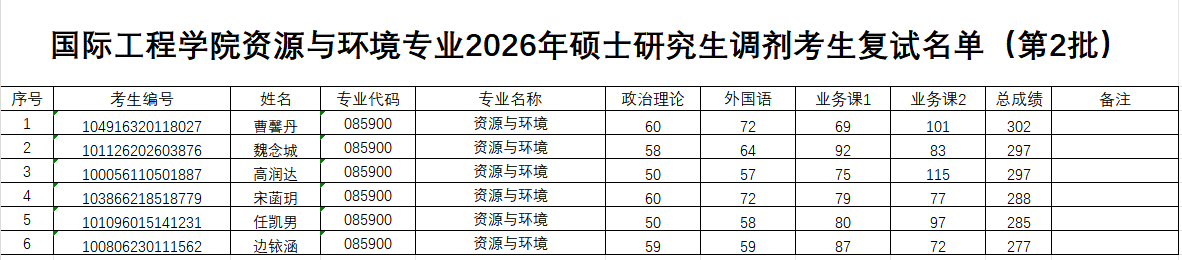 国际工程学院资源与环境专业2026年硕士研究生调剂考生复试名单(第2批)